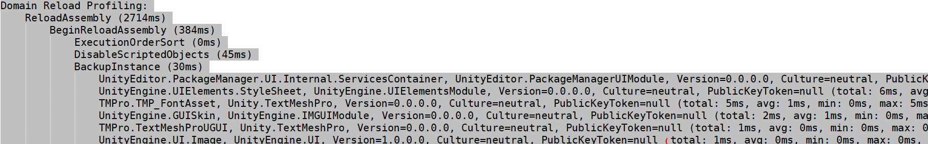 이를 위해 Edit -> Preferences -> Diagnostics -> EnableDomainReloadTimings를 True로 세팅한다. 이렇게 하면 유니티의 리로드 관련한 에디터 로그를 남길 수 있다. 에디터 로그는 C:/User/AppData/Local/Unity/Editor/Editor.log에 남는다.