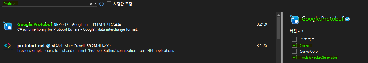 - 생성된 Protocol.cs를 프로젝트에서 사용하기 위해서는 Google.Protobuf를 NuGet 패키지에서 설치해야 함.