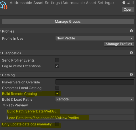 이 설정이 활성화되면 Addressable Asset System이 자동으로 카탈로그를 업데이트하지 않고 수동으로만 업데이트할 수 있도록 설정됩니다. 이는 Addressable Asset System이 자동으로 리소스를 업데이트하지 않고 사용자가 명시적으로 업데이트하도록 제어할 때 유용합니다.
