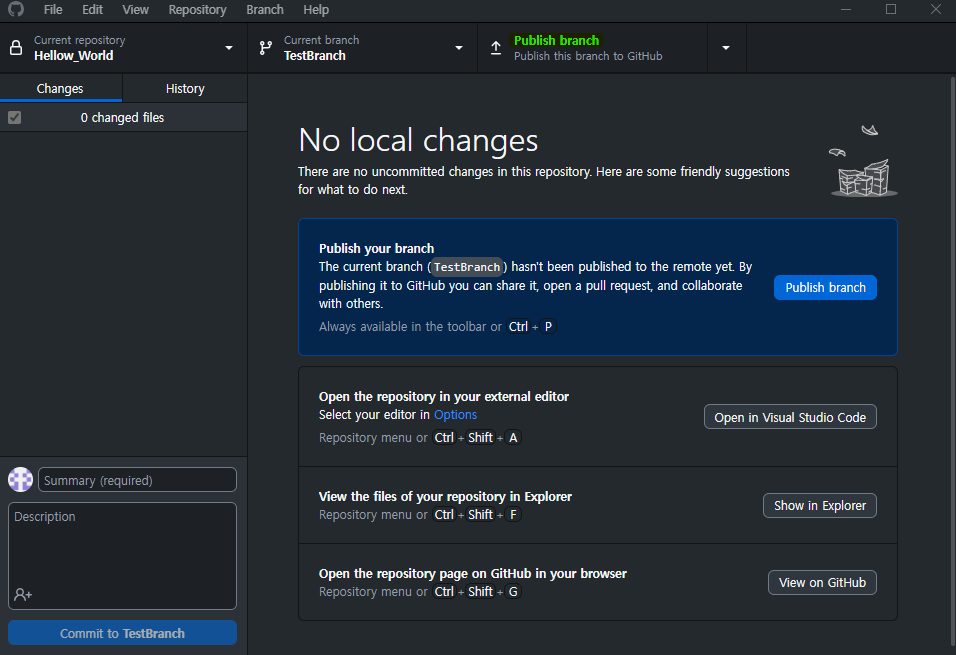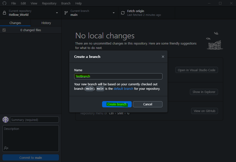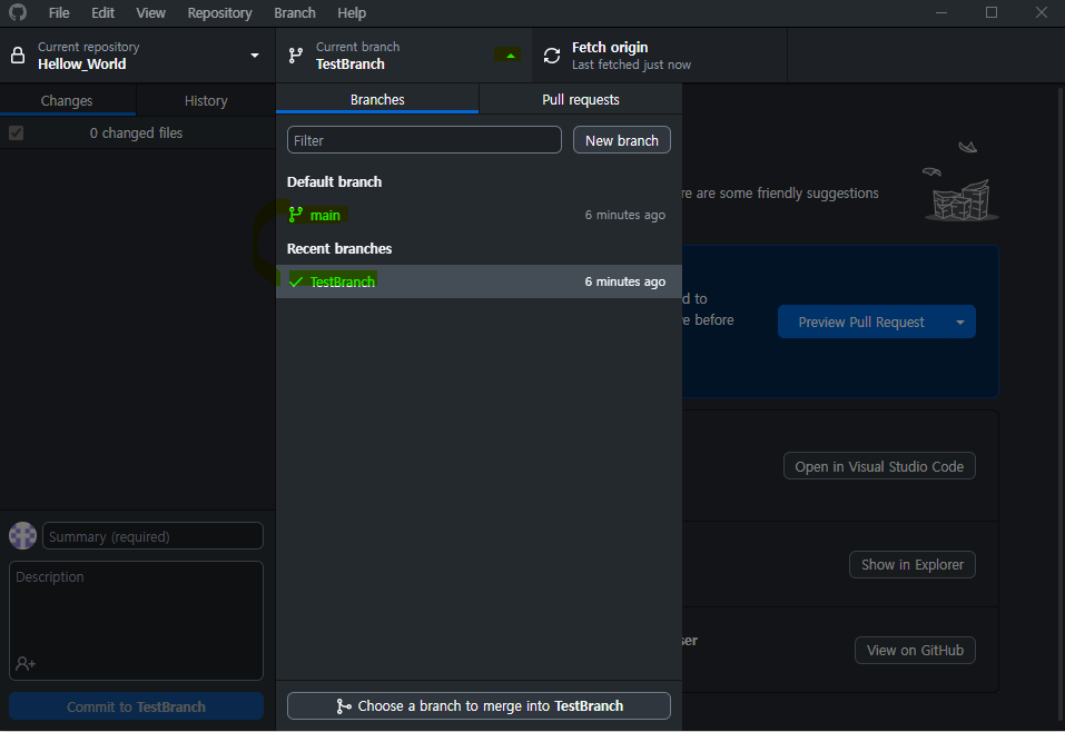화살표 클릭시 브런치 목록확인 방금만든 TestBranch와 Main이 나타난다. 클릭시 해당 Branch로 변경된다.