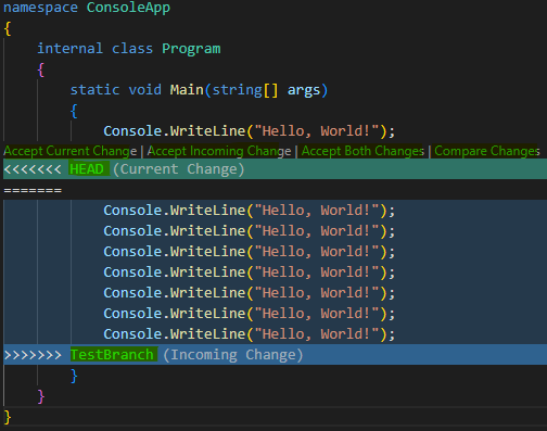 - Accept Both Changes (두 내용을 모두 적용하기): 현재 브랜치와 다른 브랜치의 변경 사항을 모두 택합니다. 이 옵션을 선택하면 양쪽의 변경이 모두 적용되며 충돌이 해결됩니다.