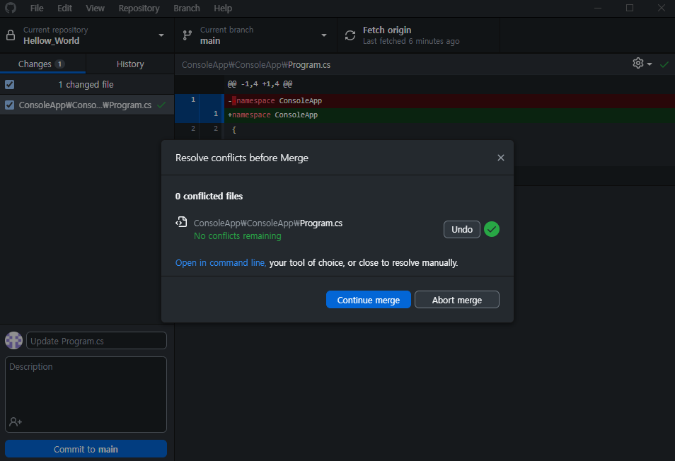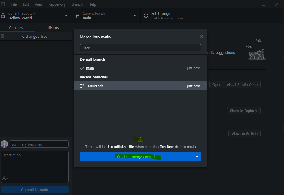 Create a merge commit 버튼 클릭 후 Desktop 화면