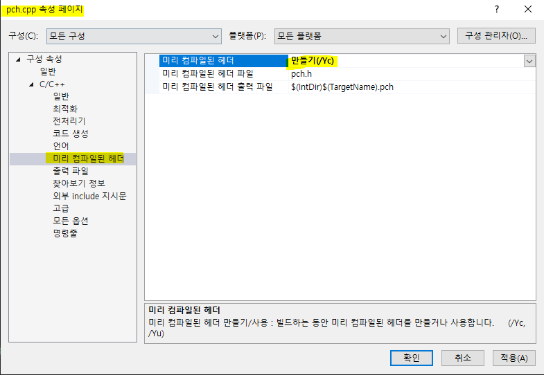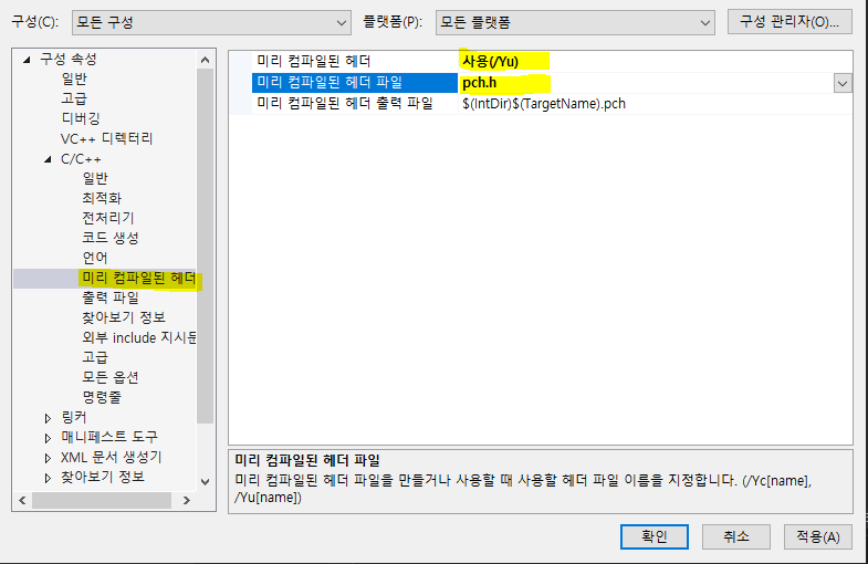 4. pch.cpp의 속성창에서 미리 컴파일된 헤더를 만들기로 변경해 주고 적용과 완료를 눌러주면 pch를 사용할 수 있다.