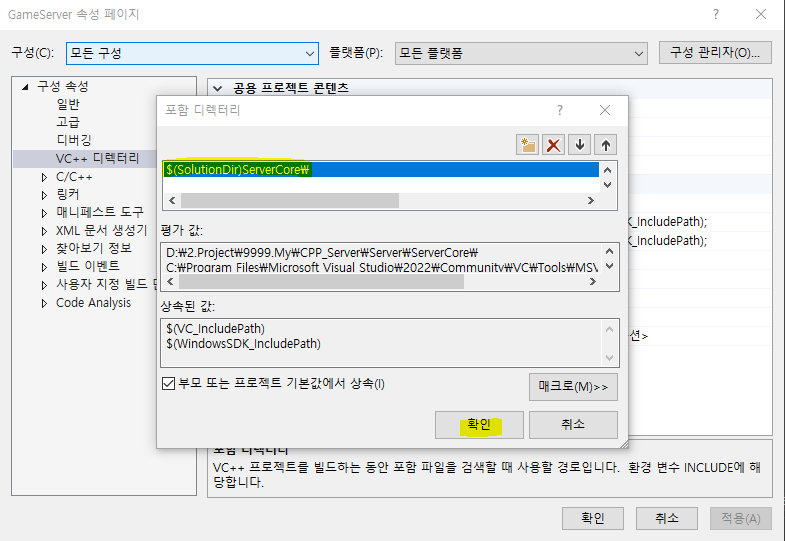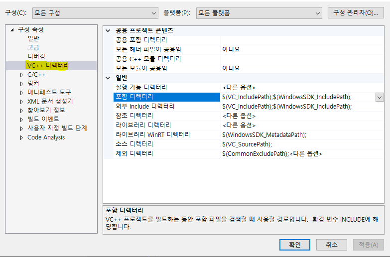 모든 구성으로 변경하는 이유는 한 번에 Debug, Release에 모두 적용할 수 있기 때문이다.