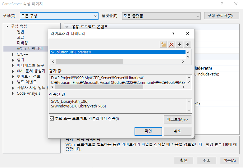 1. 라이브러리를 참조할 프로젝트의 속성창의 VC++ 디렉터리를 클릭한다.