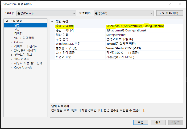 4. 출력 디렉터리를 클릭 후 만들었던 Libraries폴더이름을 SolutionDir 사이에 넣어준다.
