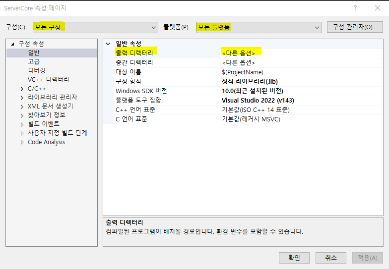 3. 구성을 모든 구성으로 플랫폼 모든 플랫폼으로 변경한다. 변경하면 출력디렉터리등이 변경되는 걸 볼 수 있다.
