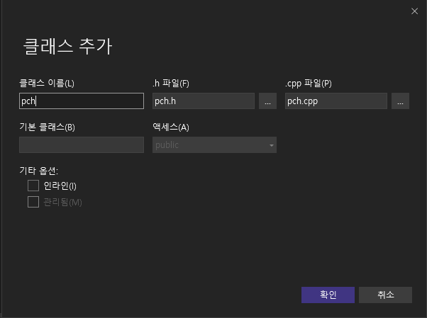 pch는 프리컴파일헤더(precompiled header)로 미리 컴파일된 헤더이다.
