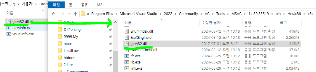 다운받은 glew폴더의 bin폴더안 x64폴더를(ex - Downloads\glew-2.1.0-win32\glew-2.1.0\bin\Release\x64)