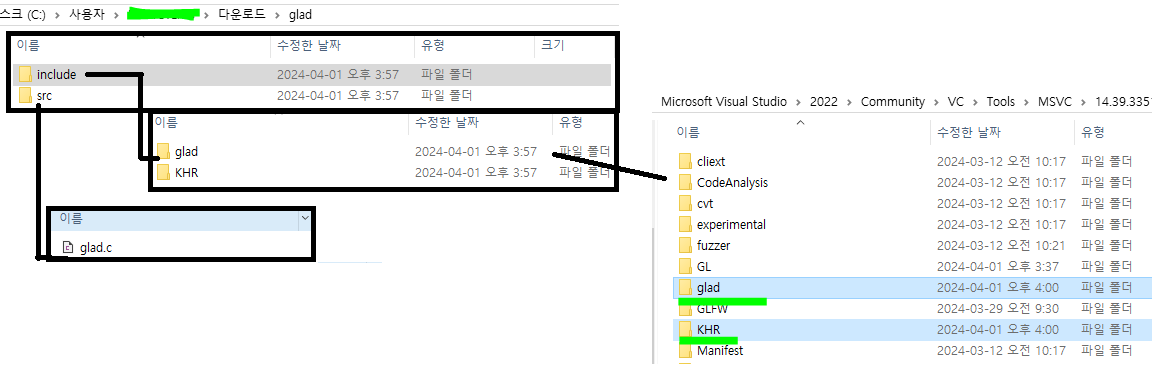 다운받은 glad폴더의 include폴더안 glad, KHR폴더를