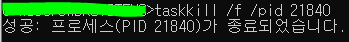 3. 찾은 PID를 taskkill /f /pid 아이디값을 입력하여 삭제한다.