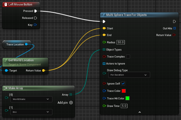 Multi Sphere Trace for Objects는 다수의 구 형태의 레이를 발사하여 객체와의 충돌을 감지하는 방법입니다.