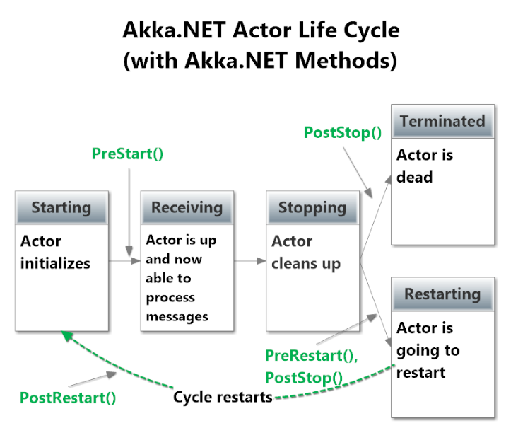 Akka.NET의 액터 라이프 사이클은 5단계로 구성됩니다.