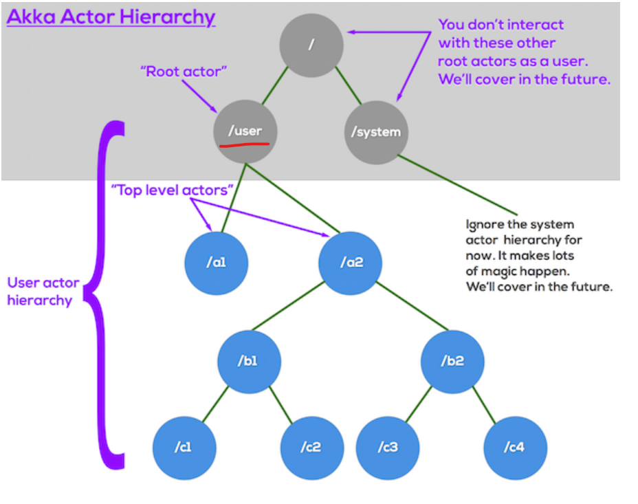 액터는 계층을 형성합니다. 즉, 본질적으로 자신에게 직접 보고하는 "최상위" 액터가 있고 ActorSystem다른 액터에게 보고하는 "자식" 액터가 있습니다. 자식 액터를 만드는 이유는 시스템의 복잡성을 관리하고, 역할과 책임을 분리하여 더 구조적이고 유연한 액터 시스템을 설계하기 위함입니다. 자식 액터는 부모 액터의 일부 작업을 분담하여 처리하거나, 특정 기능을 전담하도록 설계됩니다. 이를 통해 부모 액터는 더 간단한 역할을 유지하며, 자식 액터는 자신만의 상태와 로직을 관리할 수 있습니다. 또한, 자식 액터는 부모 액터가 실패하거나 재시작할 때 함께 관리될 수 있어, 내결함성과 안정성을 향상시킵니다.