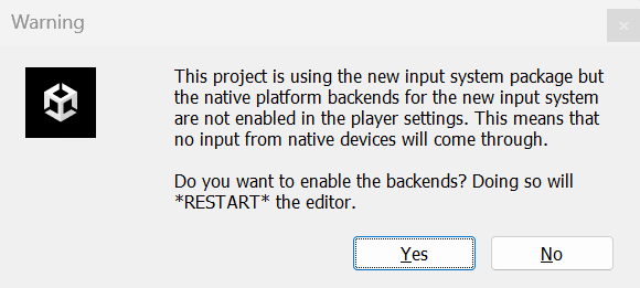 설치 후 Warning이 뜨는데 InputSystem을 새로 적용하기 위한 안내창으로 Yes 누르면 재시작되고 적용된다.