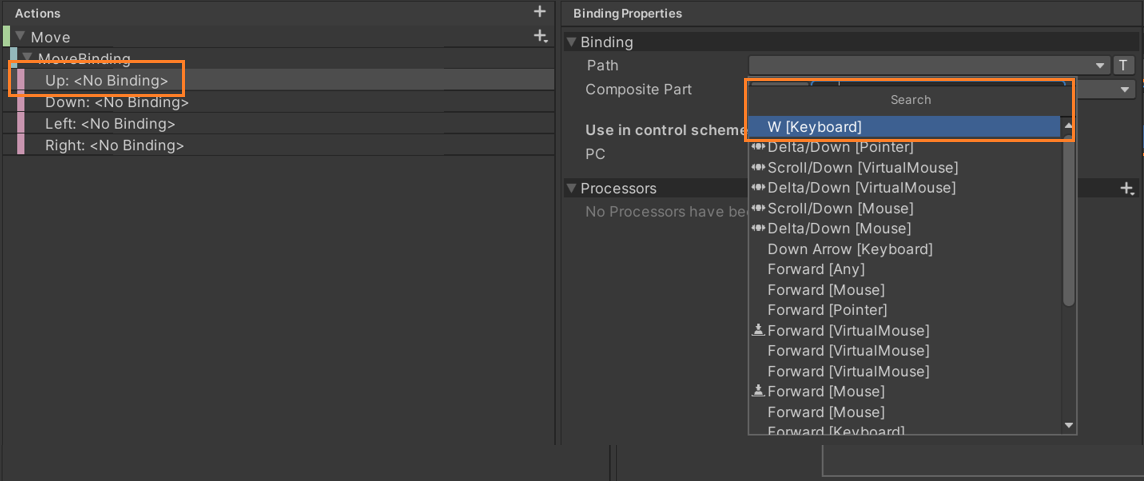 Up에 Path에 Search에서 W를 검색하여 W [Keyboard]로 설정한다. 동일한 방식으로 Down은 S, Left는 A, Right는 D로 설정한다. 이제 설정은 다됐다.