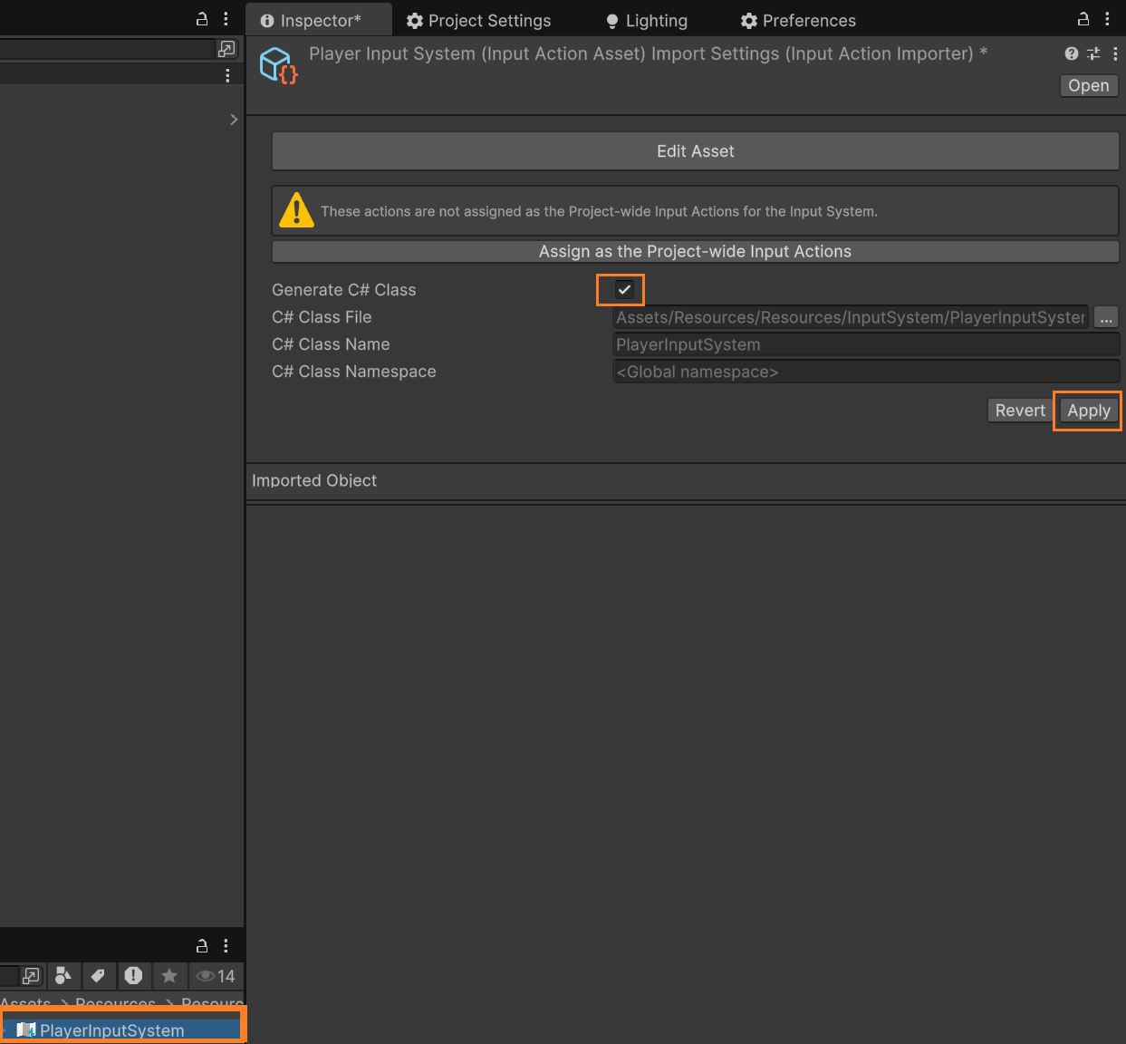 위에서 만들었던 InputActions 파일을 클릭하고 에디터 우측 상단 Generate C# Class를 체크한 후 Apply를 클릭한다.