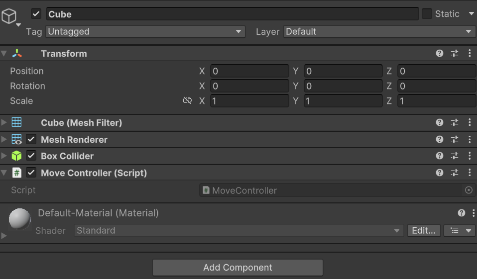 우선 제어로직을 작성할 Script를 하나 만들어 준다. 여기서는 MoveController라는 이름의 Script로 만들었다.