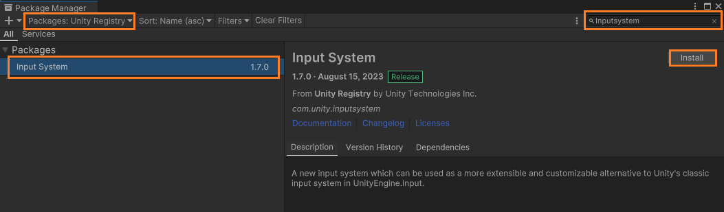Package Manager에서 Packages를 Unity Registry로 변경 후, InputSystem검색하여 Install 해준다.