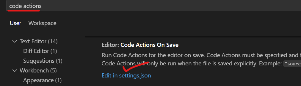 설정 -> code actions 검색 -> Editor: Code Actions On Save에 Edit in Settings.json 클릭 ->