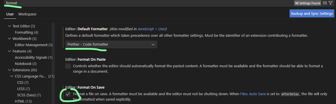 상단에 File-> Preferences -> Settings 선택 다운받은 prettier 선택 -> Format On Save 선택