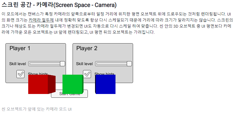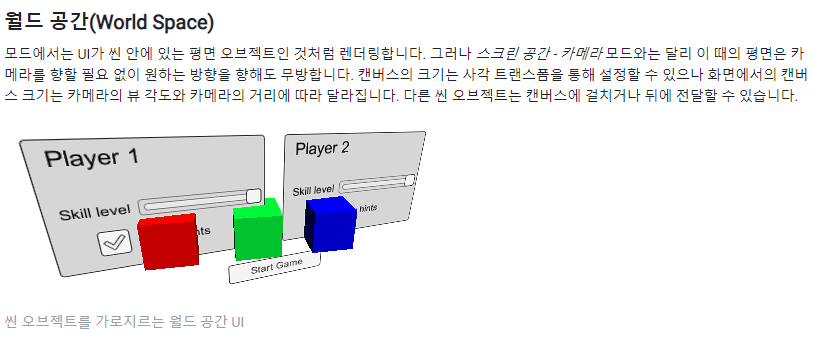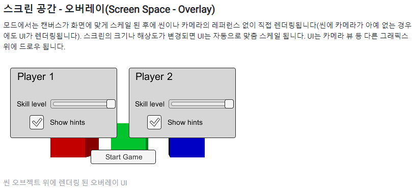 - UI 요소들이 스크린 상에만 존재하고 모든 3D 오브젝트를 먼저 그린 후에 나중에 UI 요소들이 붙어있는 캔버스가 덮어 씌워지는 방식