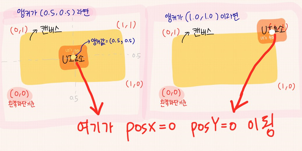 - UI요소의 기준점을 앵커 좌표에 맞춘 이 점이 UI의 요소의 (PosX = 0, PosY = 0) 원점이 된다.