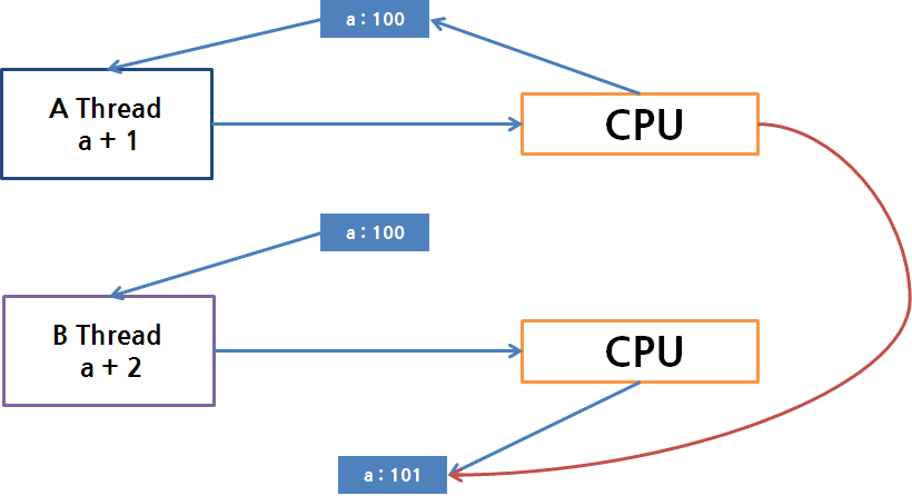 [ A 스레드의 결과가 나중에 반영되어 101이 나옴 ]